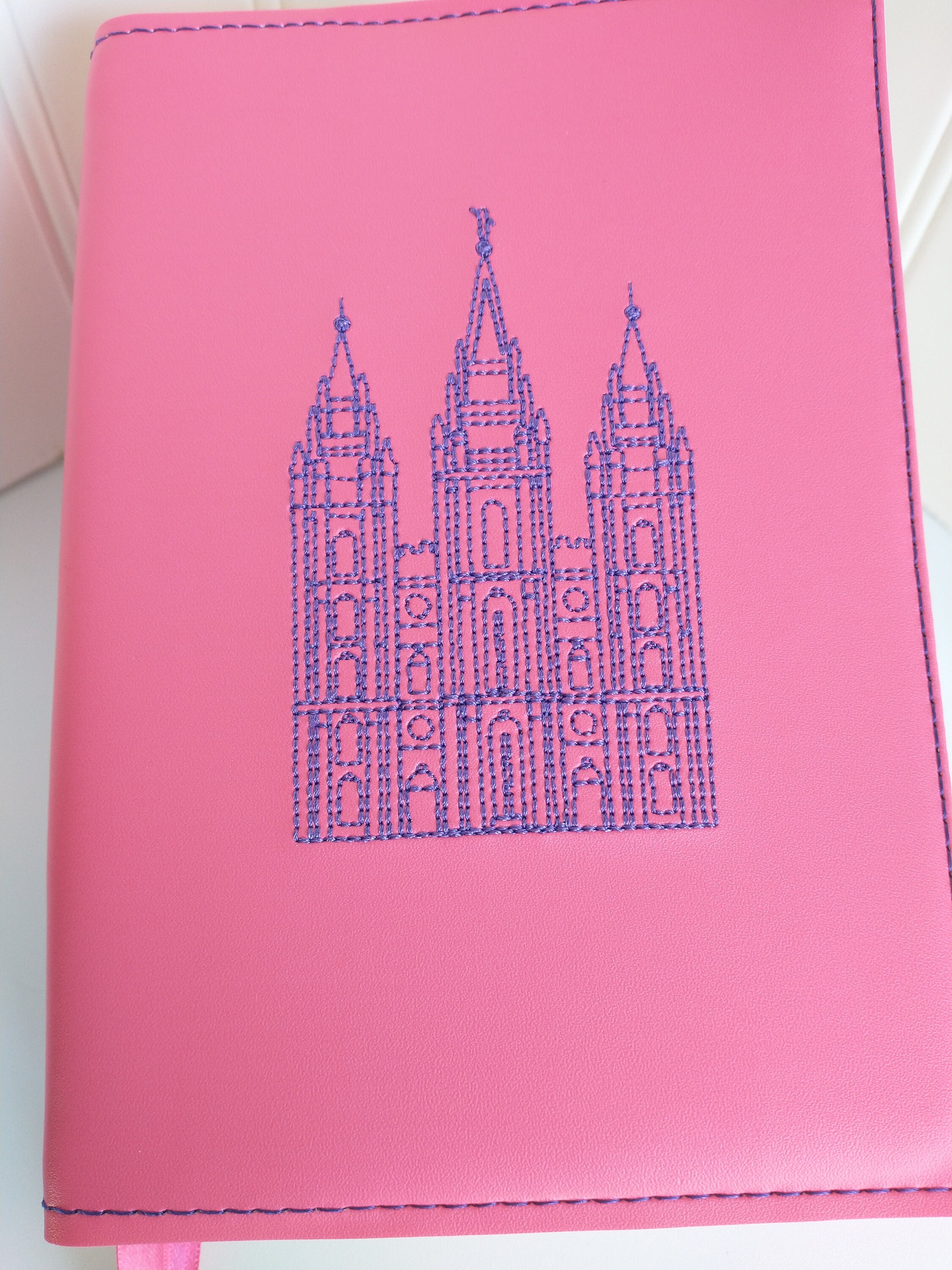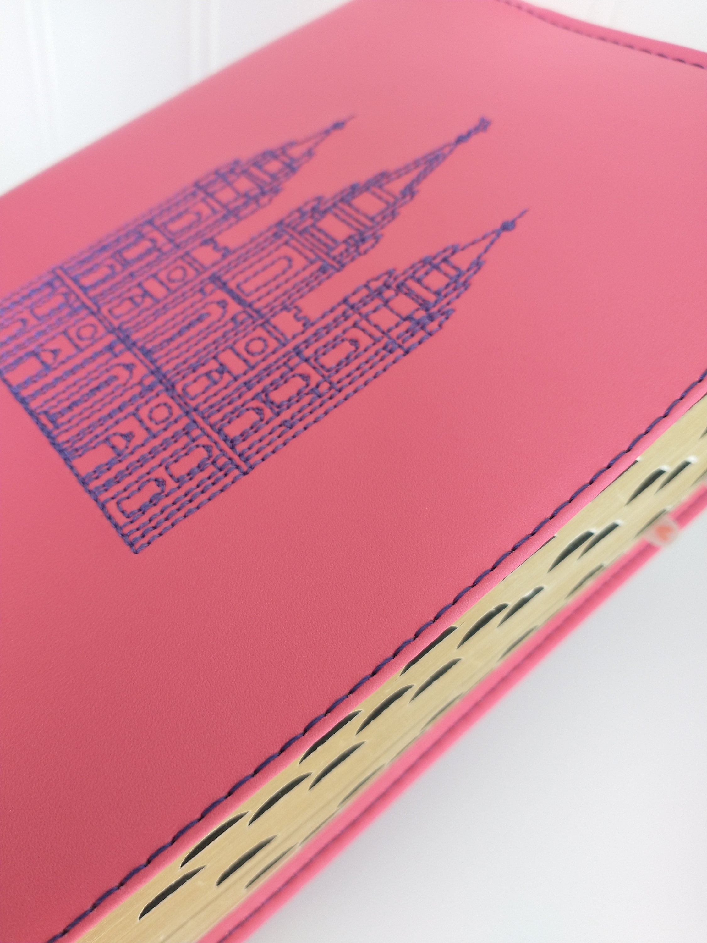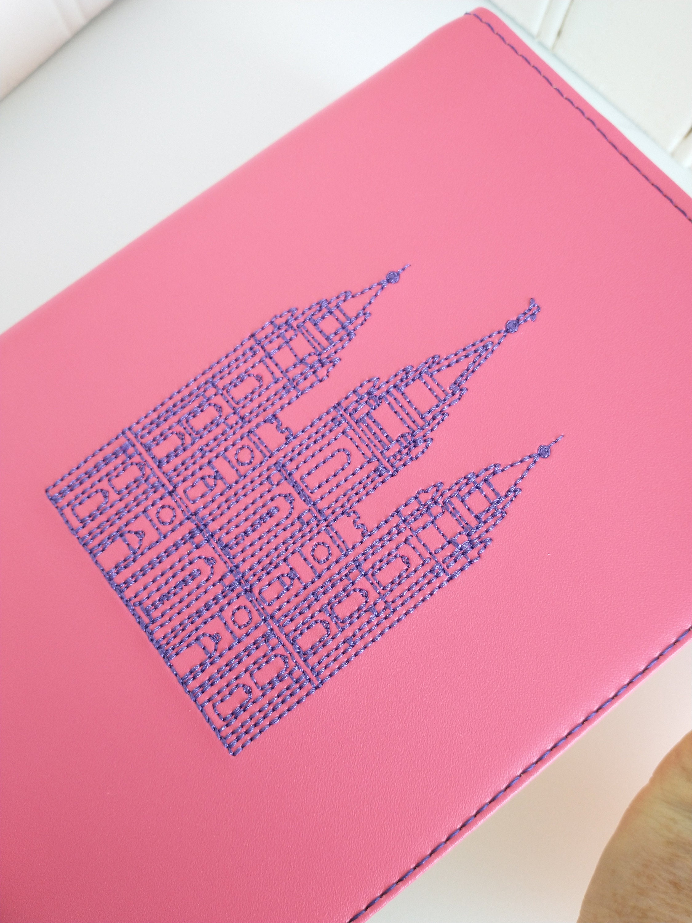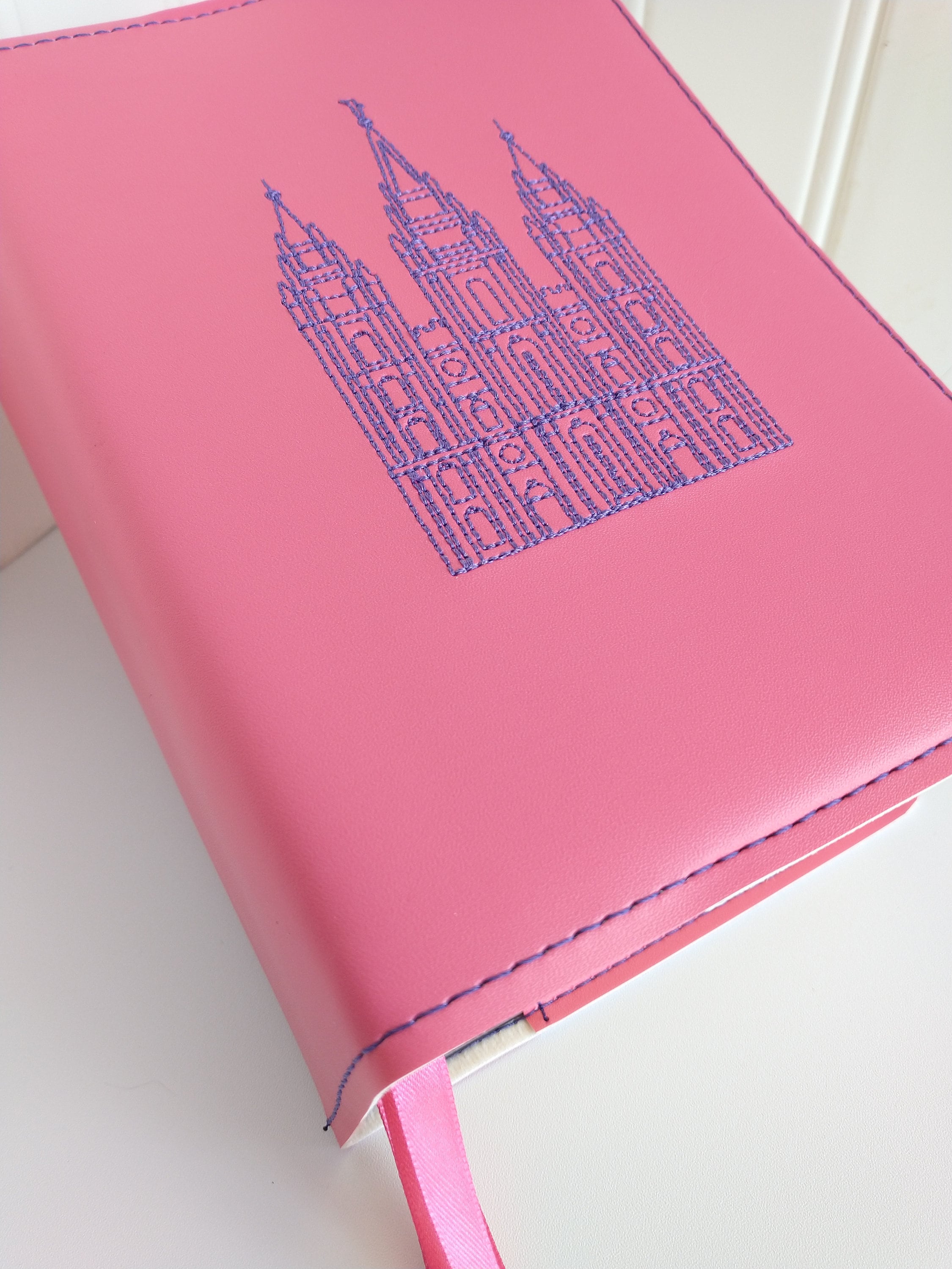 The purple embroidered Salt Lake Temple looks amazing on a hot pink faux leather!