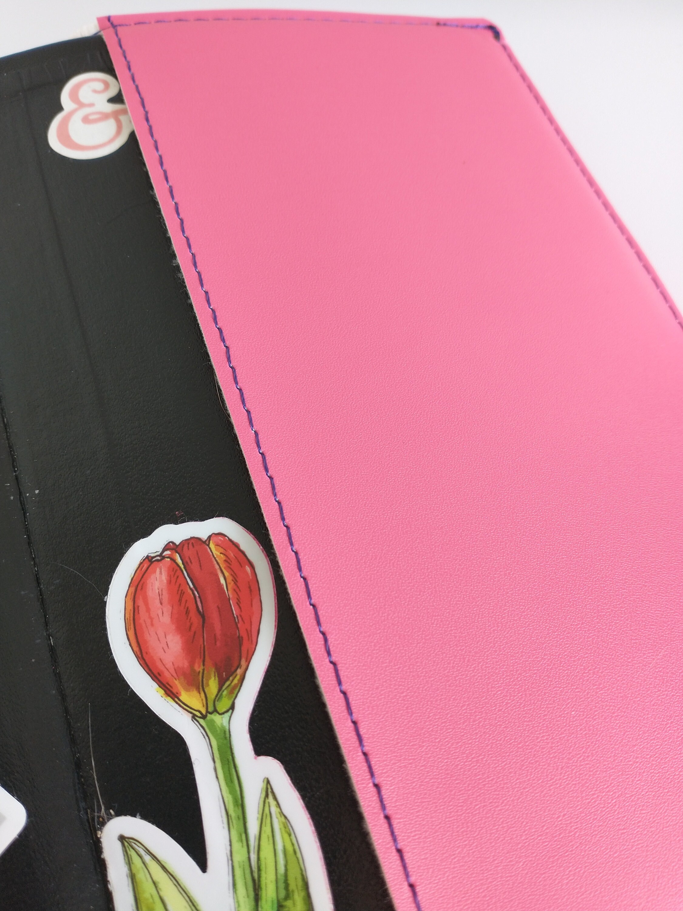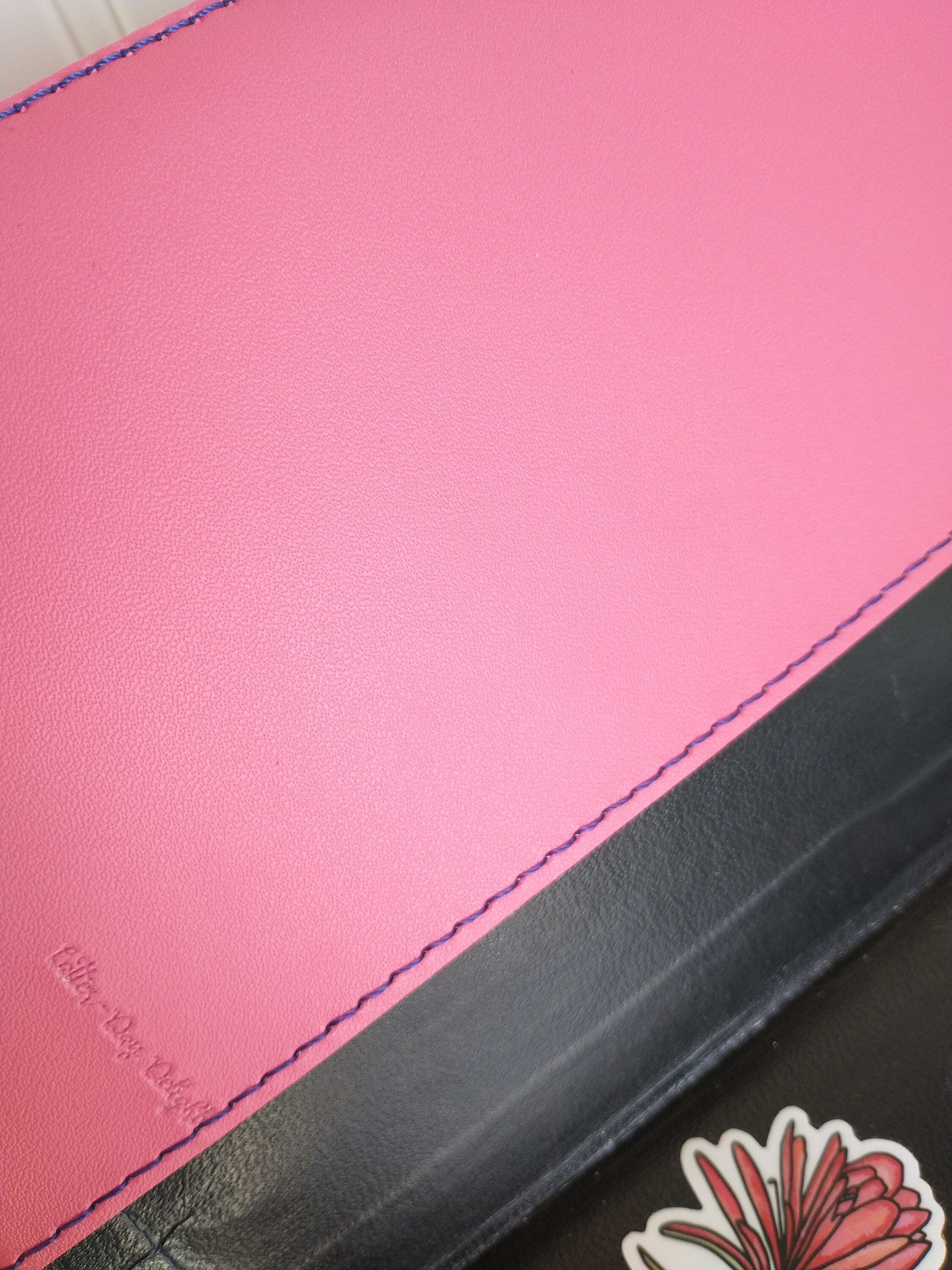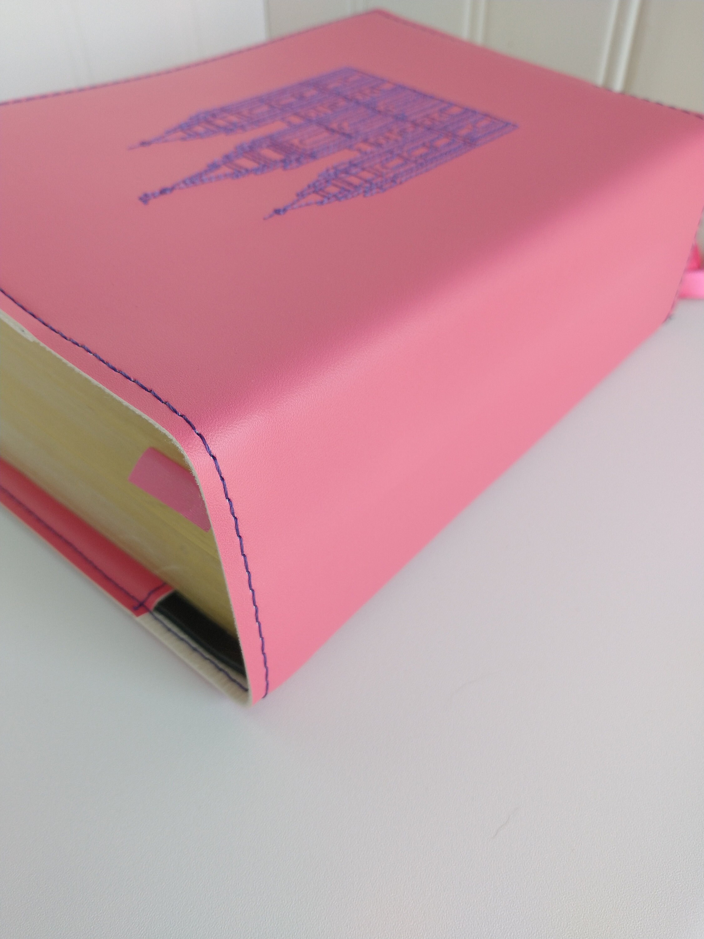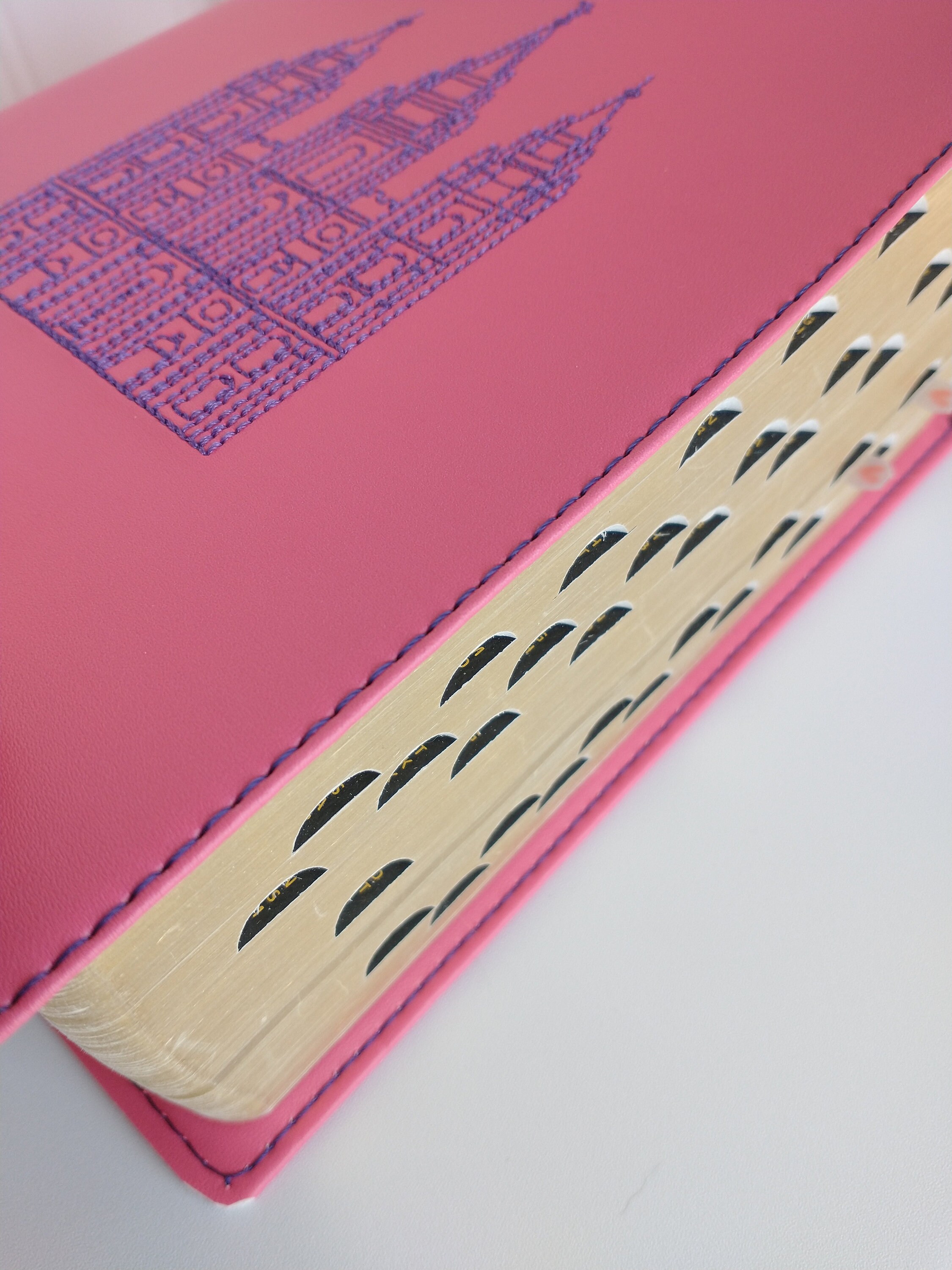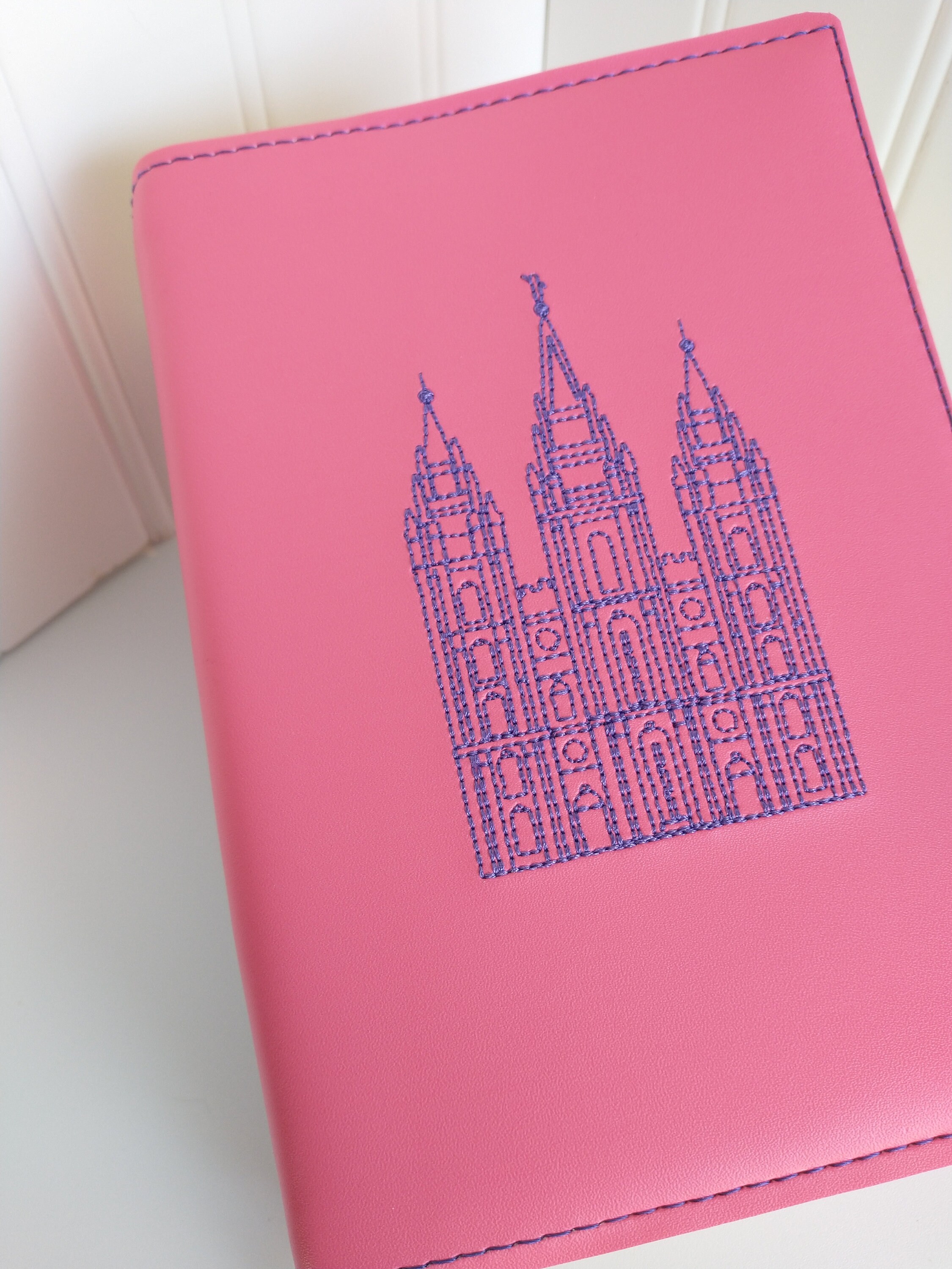 The purple embroidered Salt Lake Temple looks amazing on a hot pink faux leather!