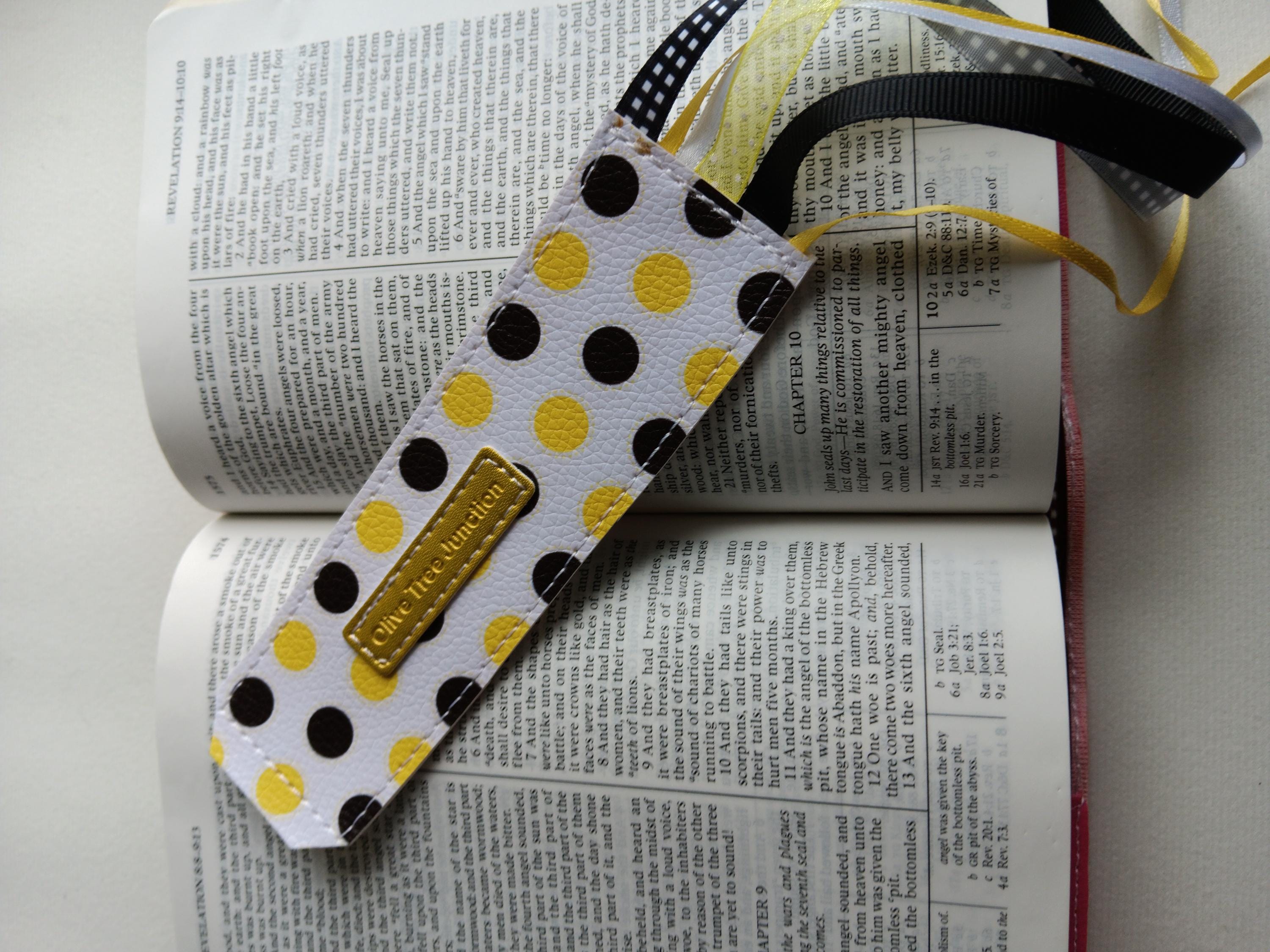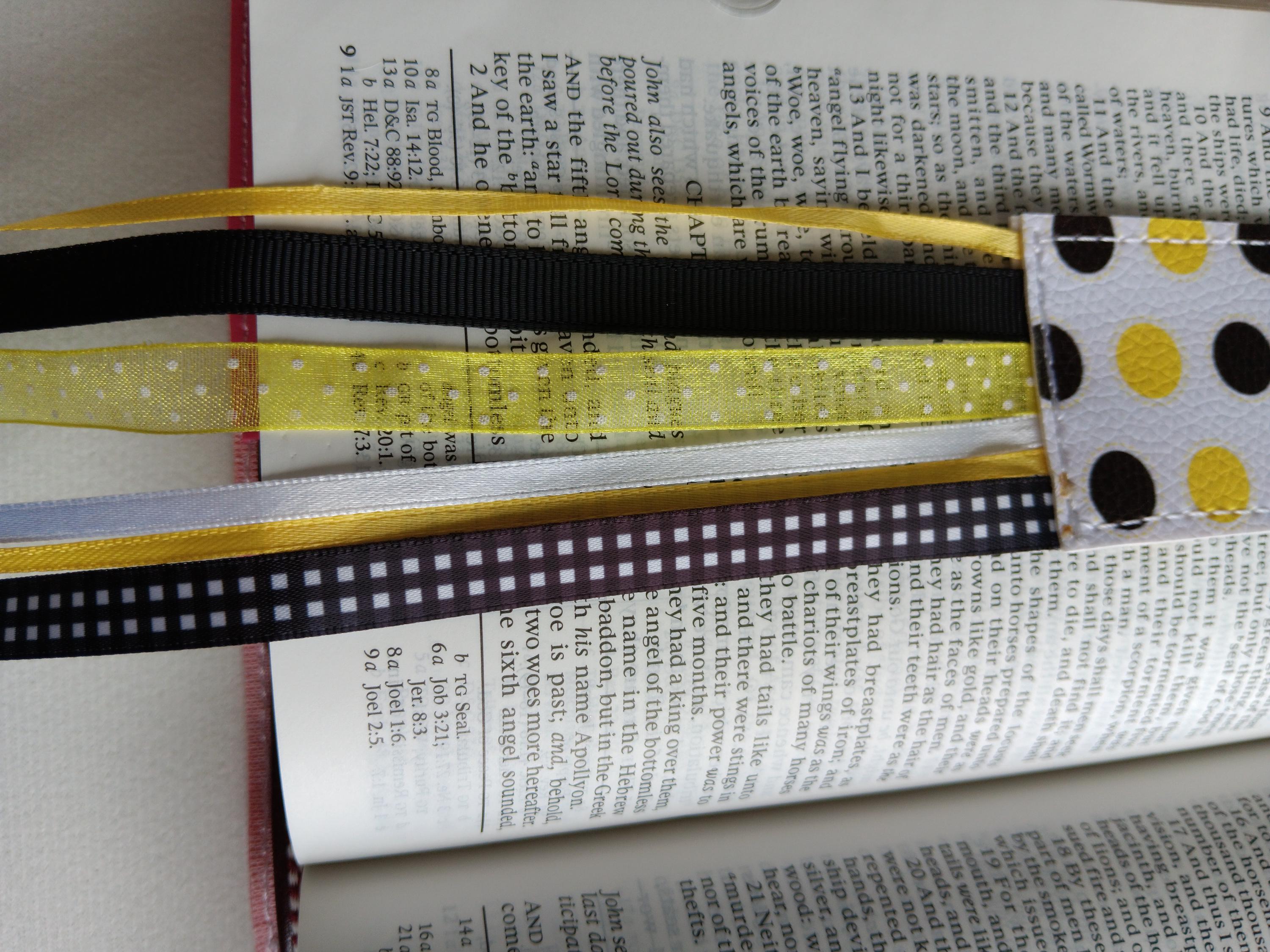 Would you like more ribbons to mark your place inside your quad? If so you need one of these quad bookmarks! Just slide the simulated leather portion into the spine of your quad and place the ribbons between the pages of your book. Pretty easy!
