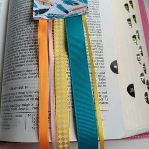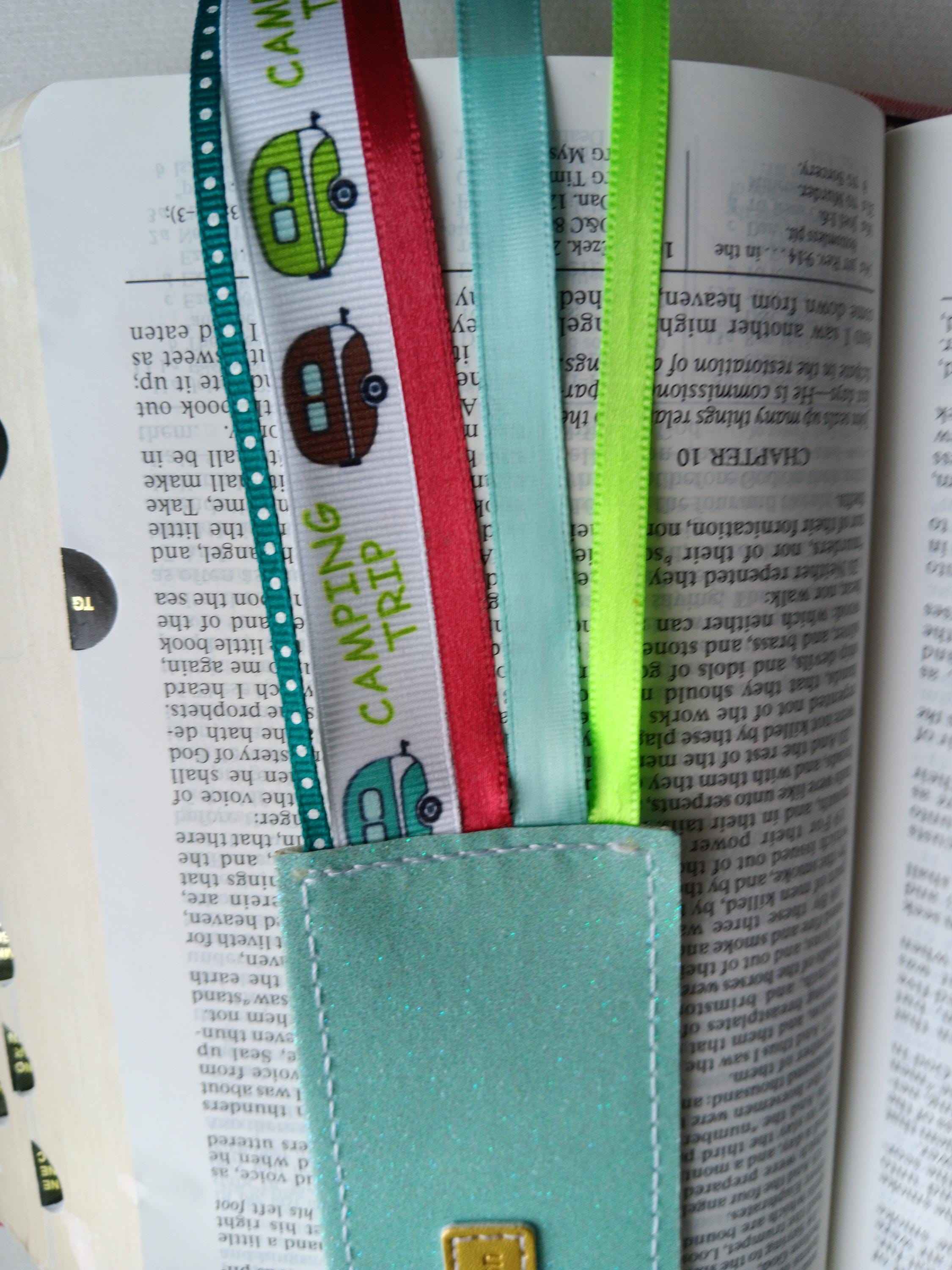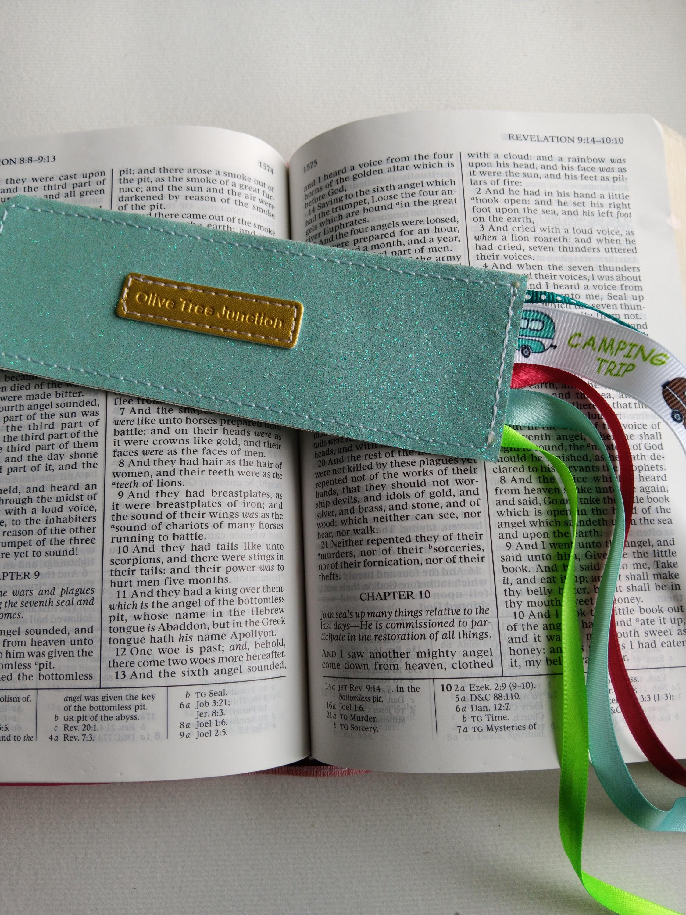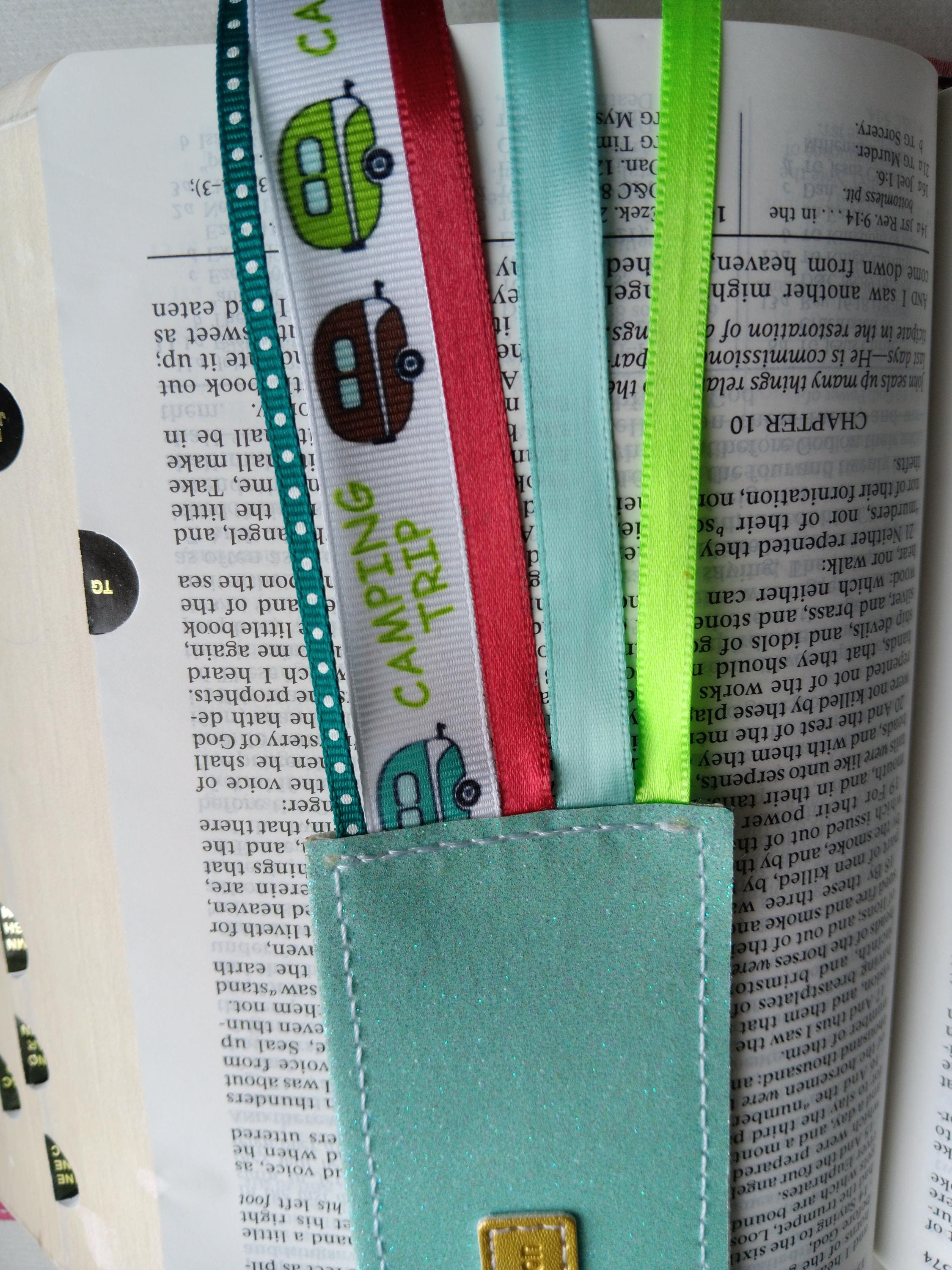 Would you like more ribbons to mark your place inside your quad? If so you need one of these quad bookmarks! Just slide the simulated leather portion into the spine of your quad and place the ribbons between the pages of your book. Pretty easy!