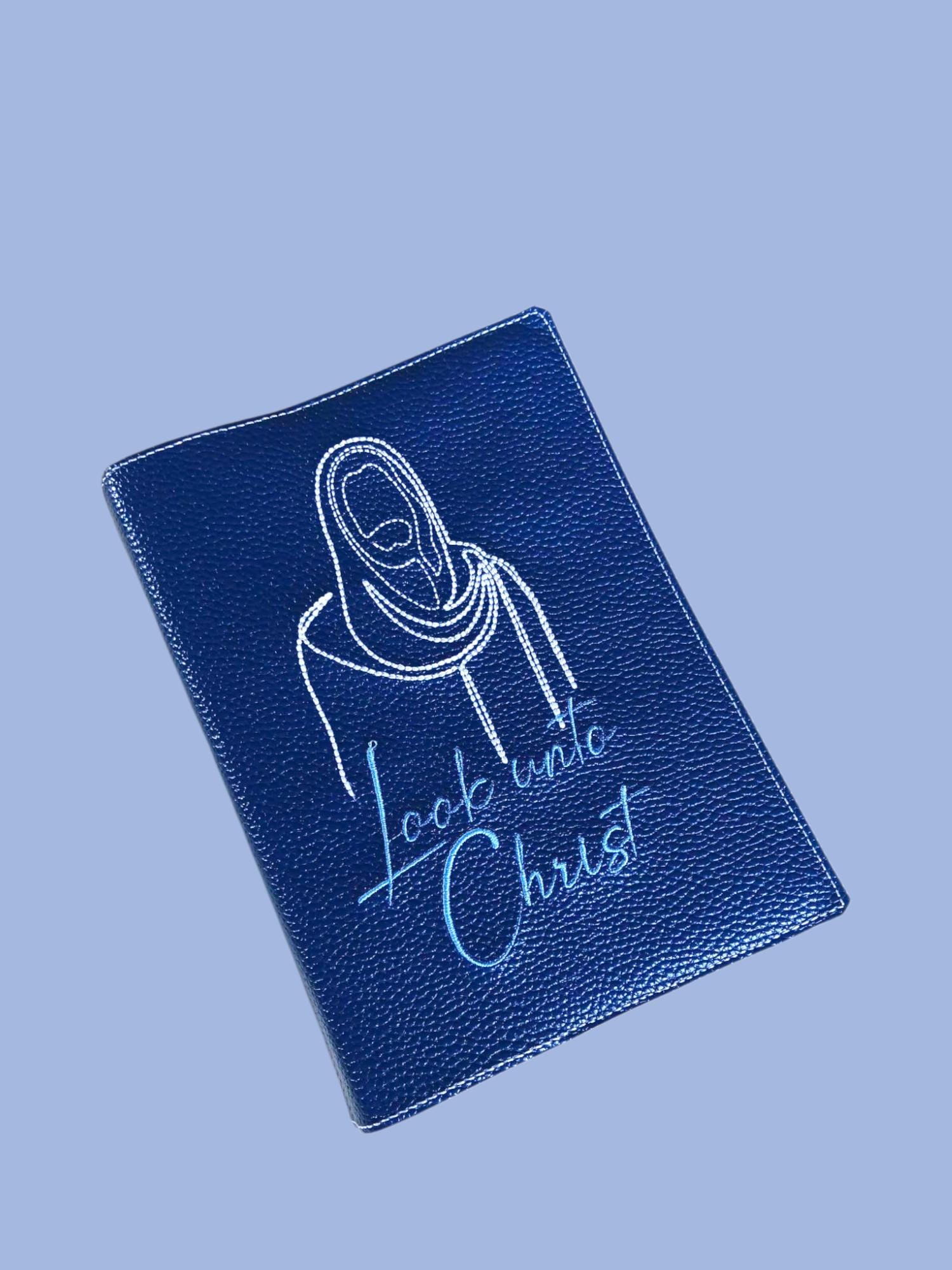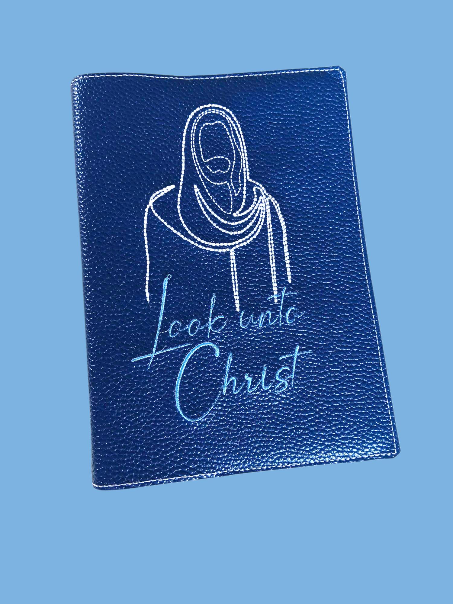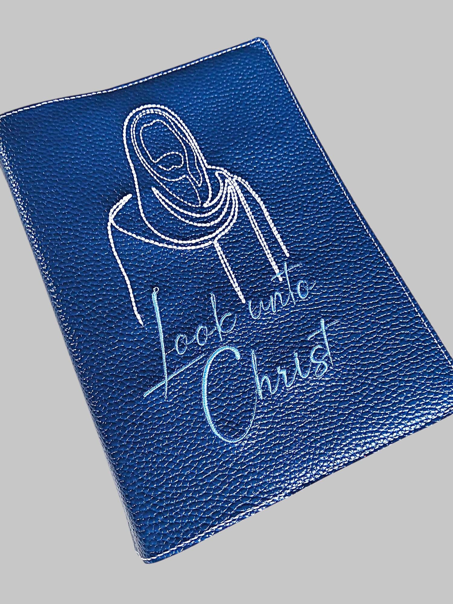 This cover has a beautiful blue faux leather background. The machine embroidery is done in white thread for Christ and a lighter blue for the font.