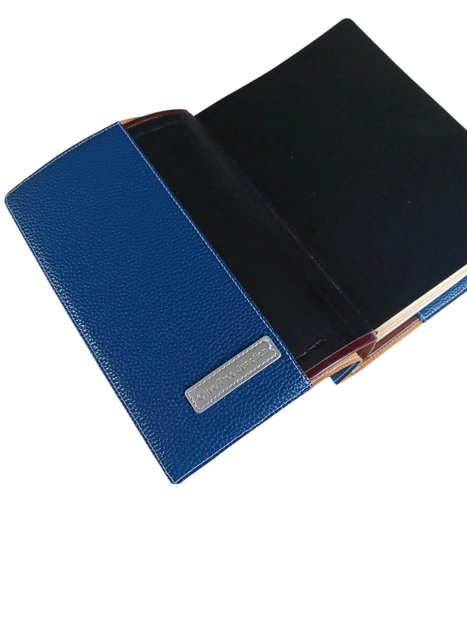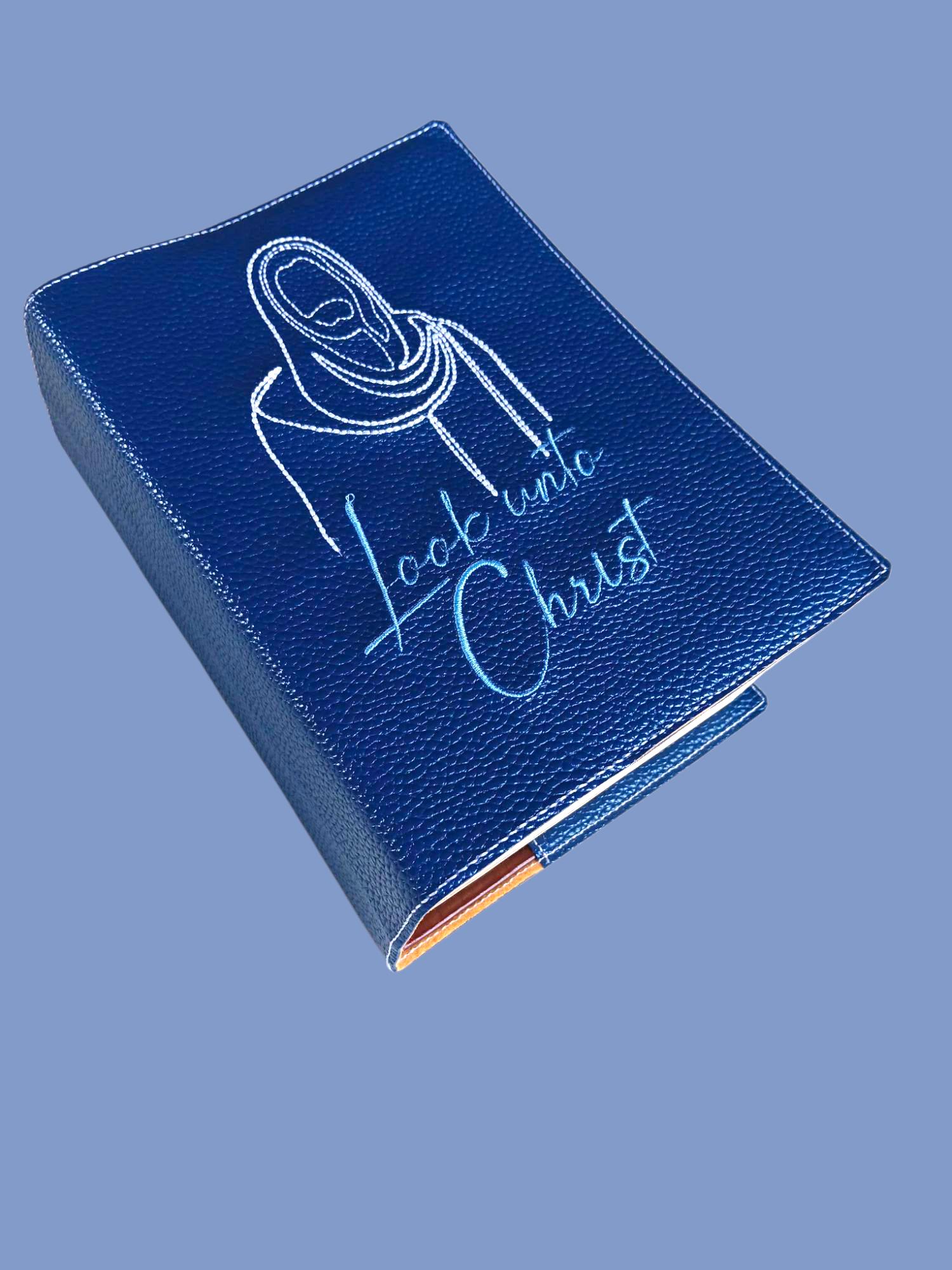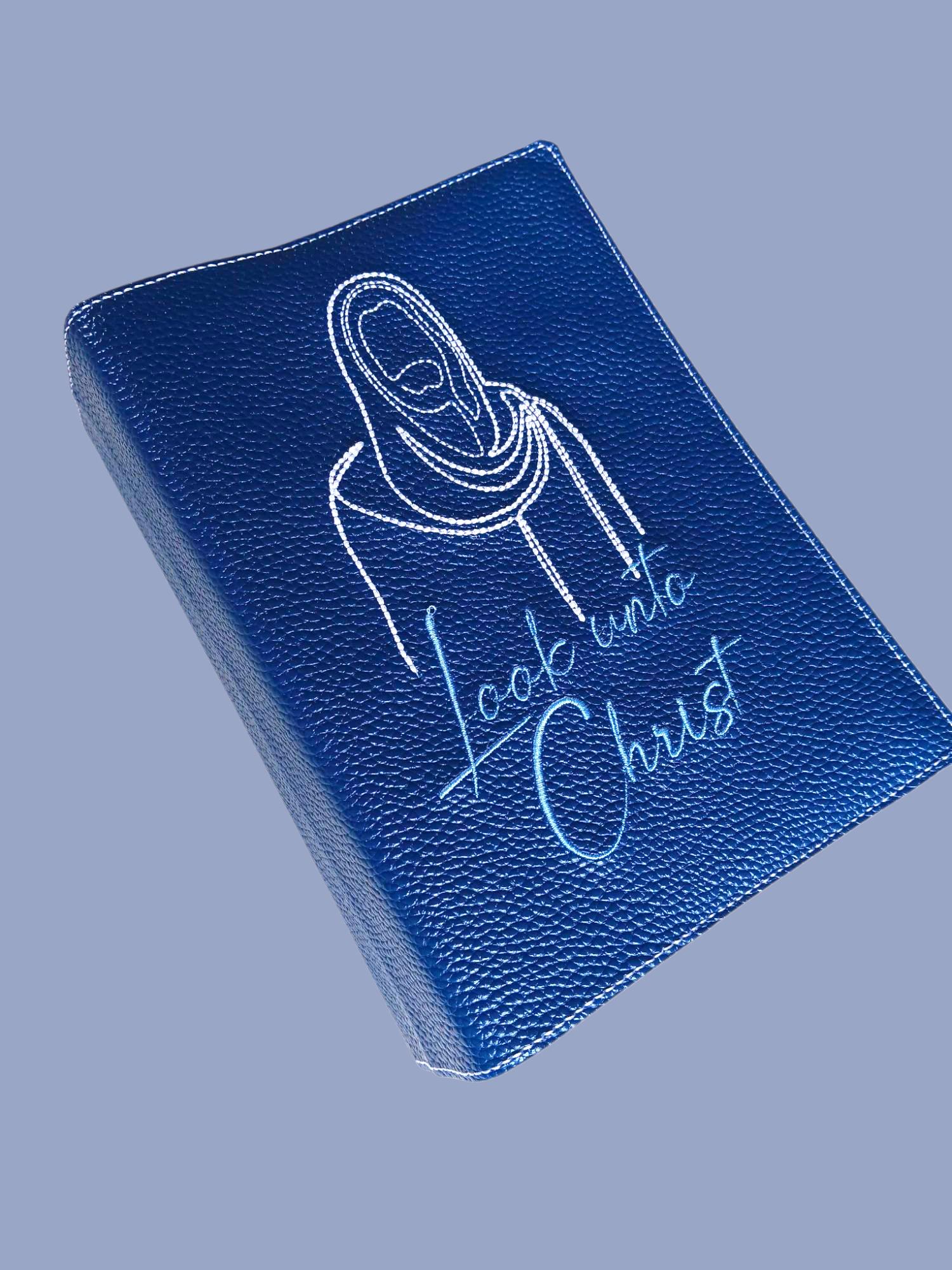 This cover has a beautiful blue faux leather background. The machine embroidery is done in white thread for Christ and a lighter blue for the font.