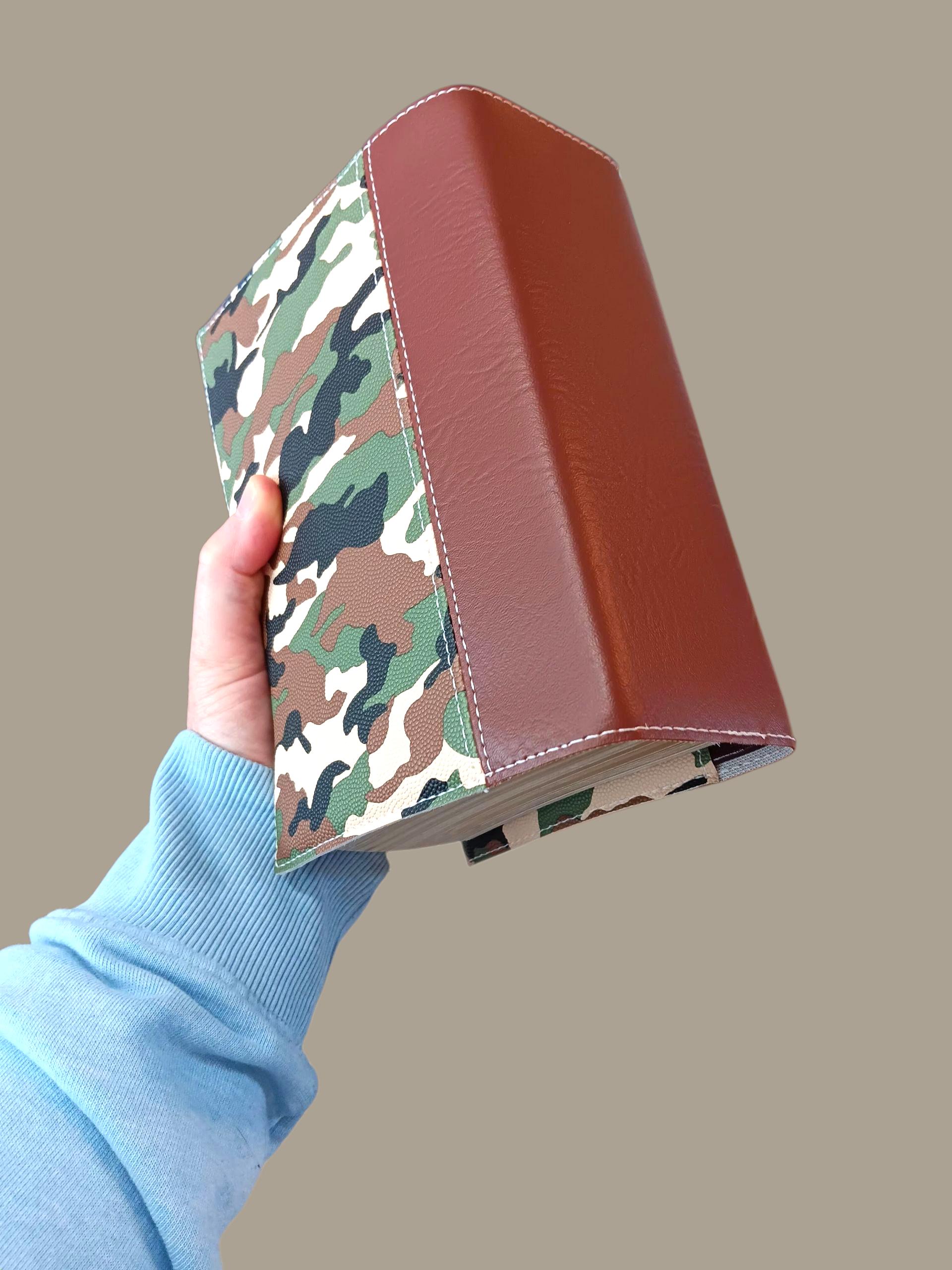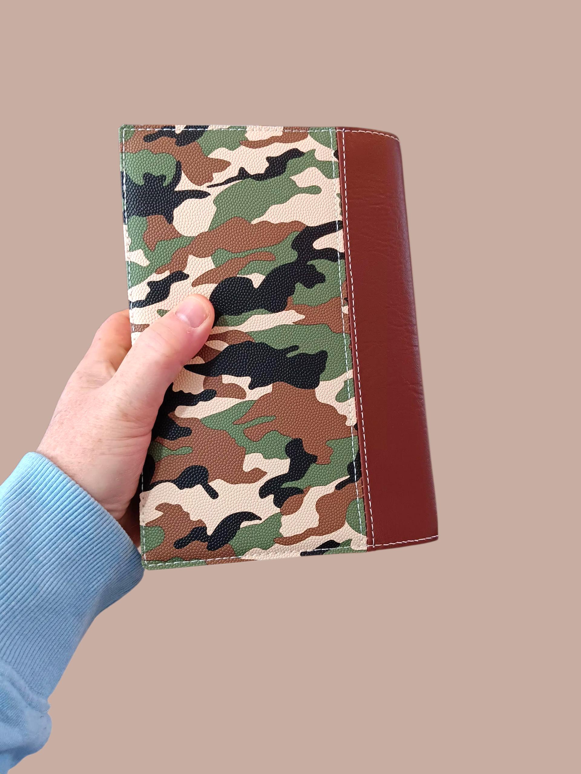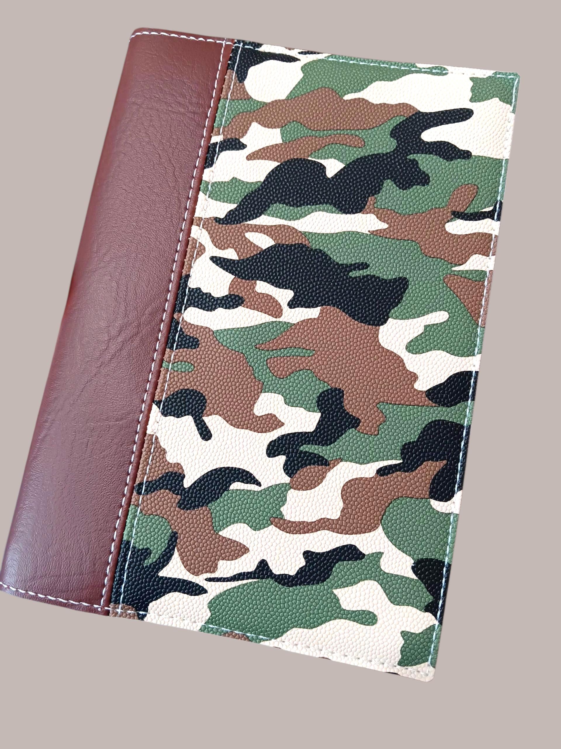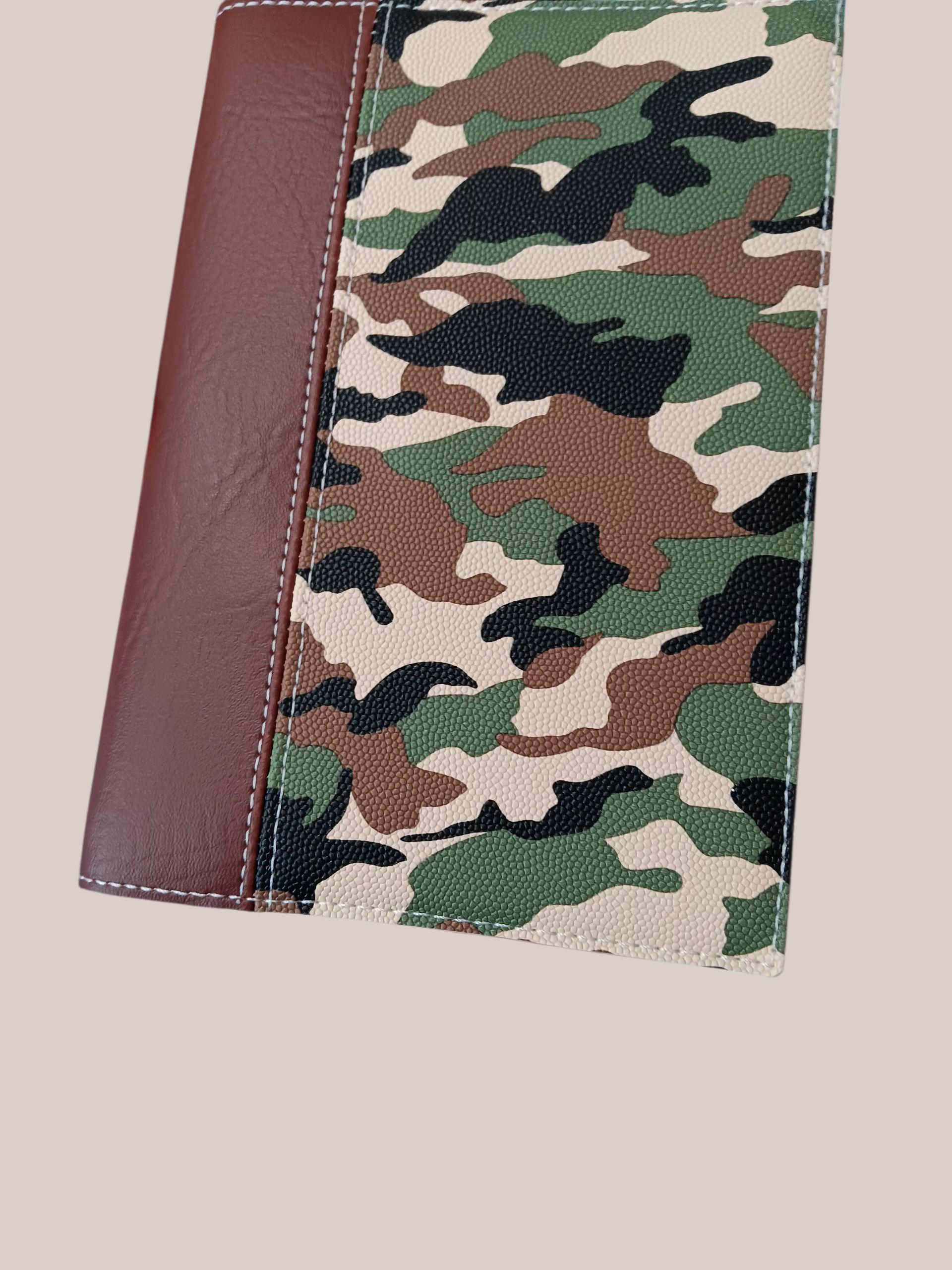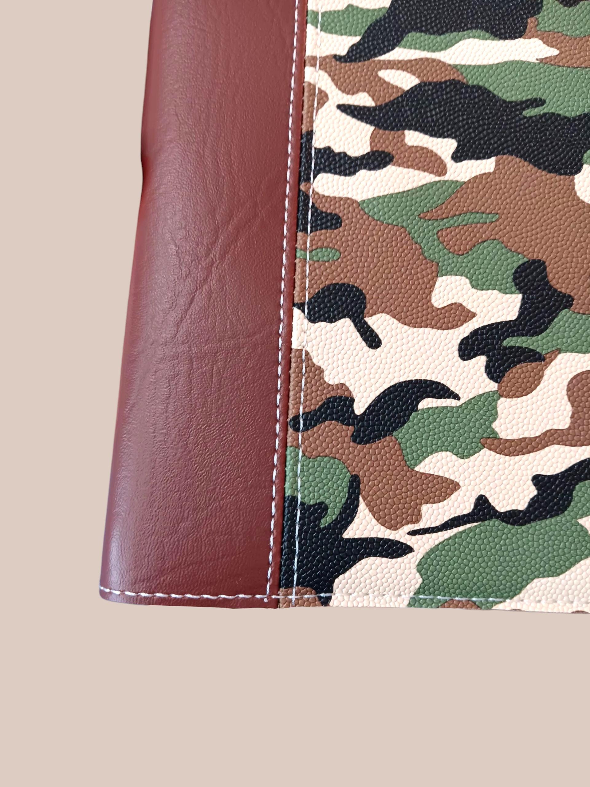 It is made from quality simulated leather. The camo print is in trafitionaltan, brown, green, and black. The spine is a solid brown.