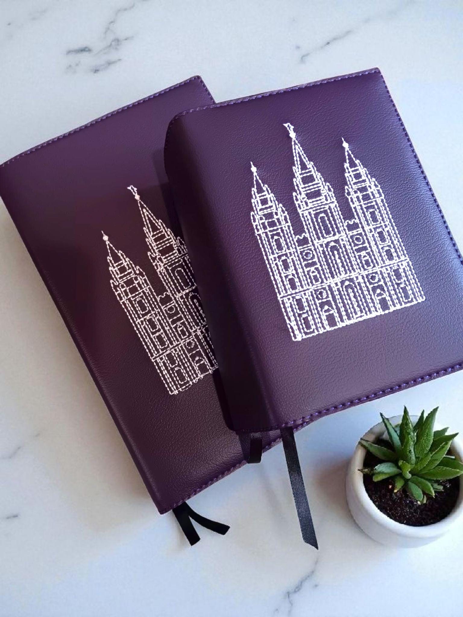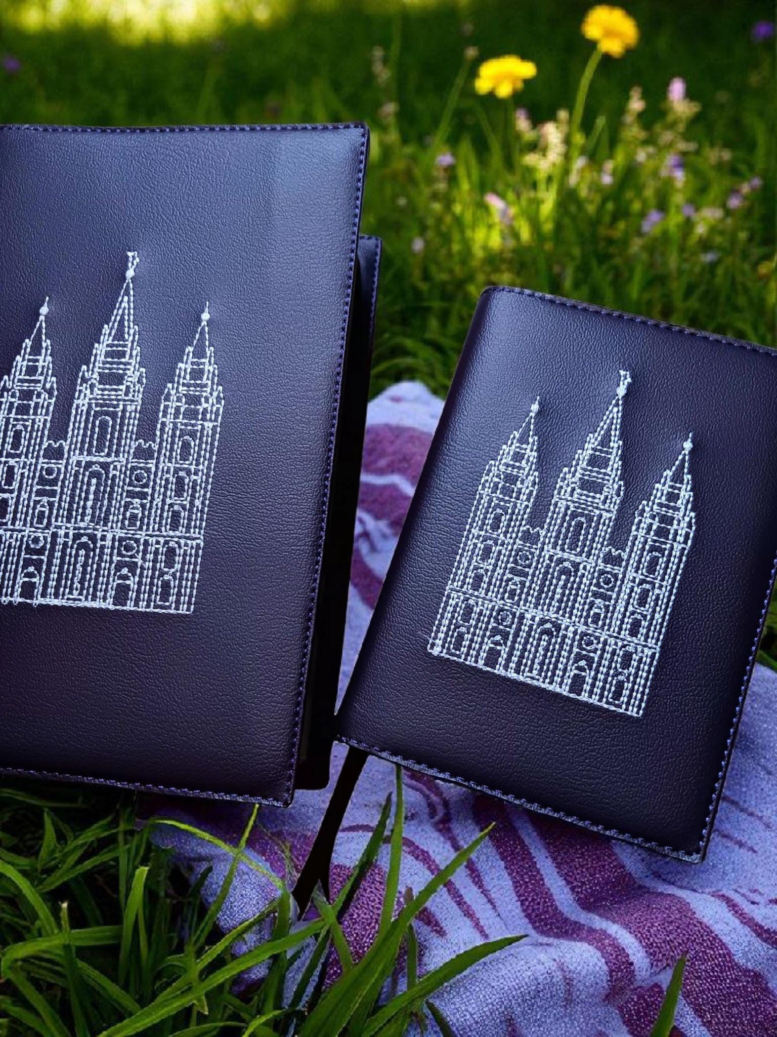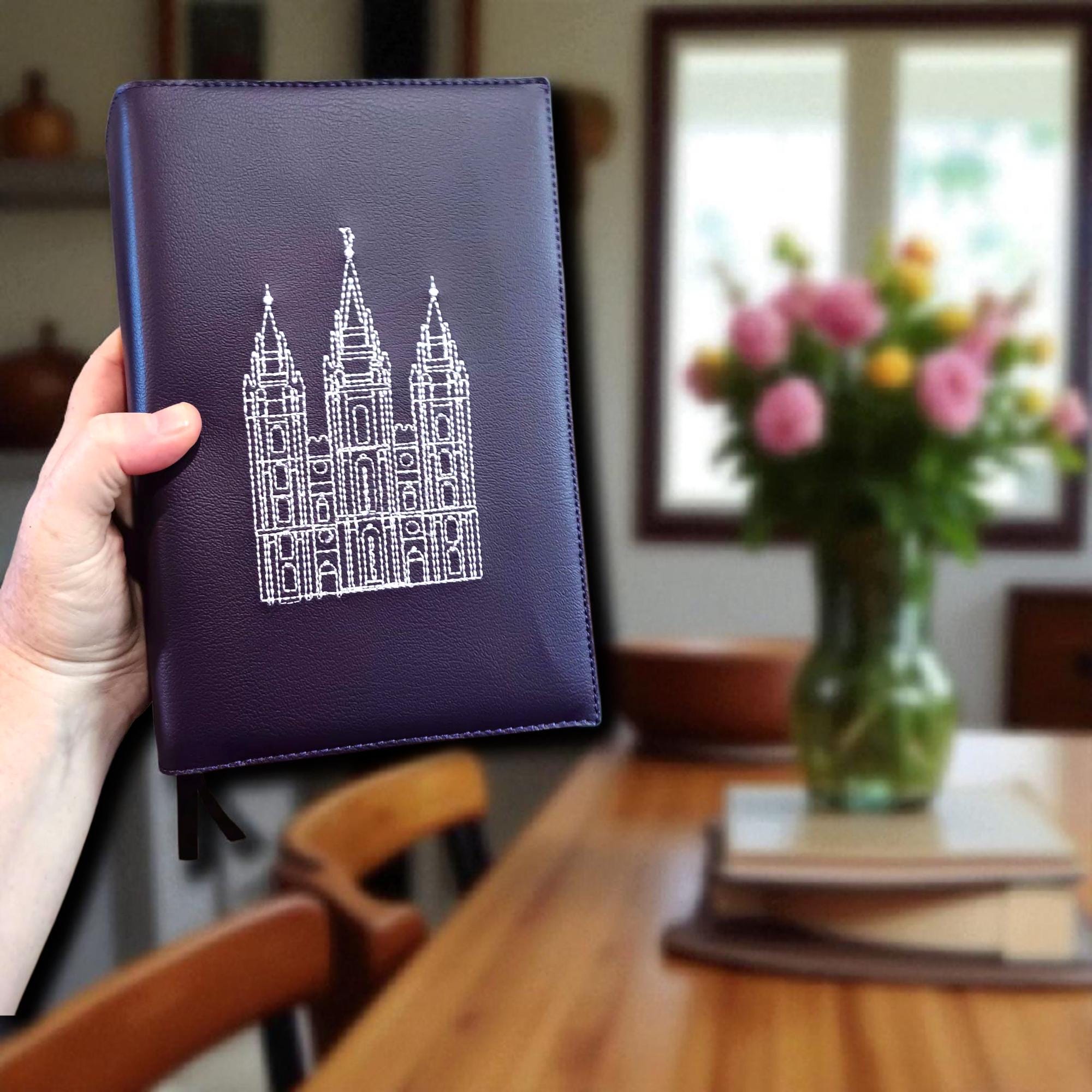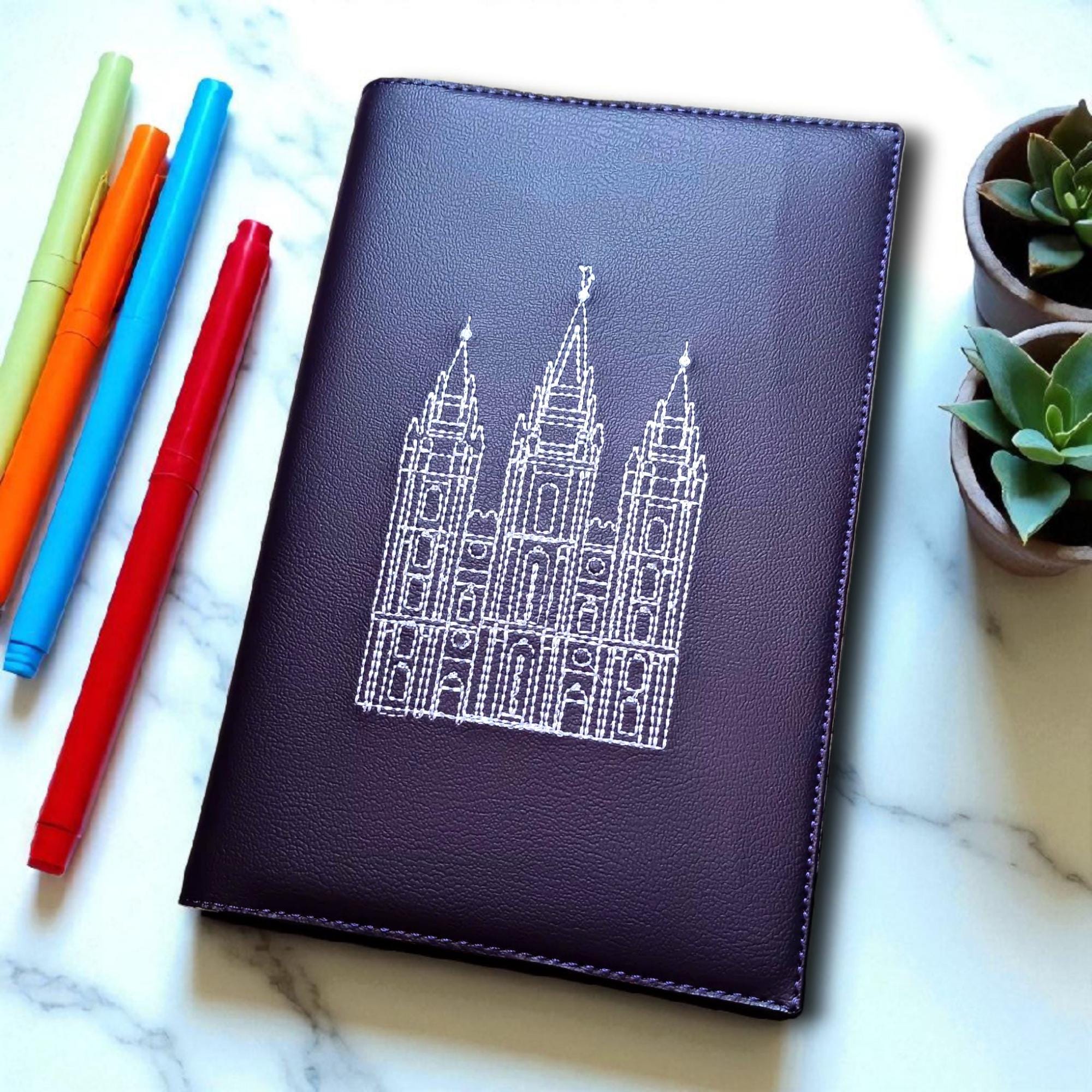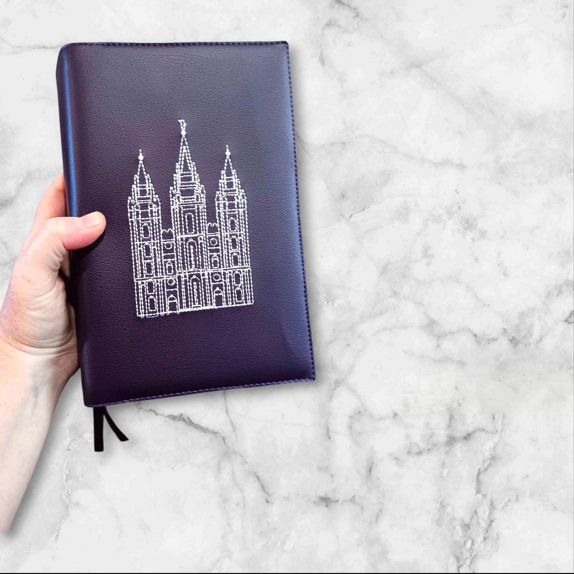This beautiful simulated leather slip cover will fit a Spanish Quadruple Combination. The dark purple background is a quality simulated leather. It features a machine embroidered Salt Lake Temple on the front. So pretty!