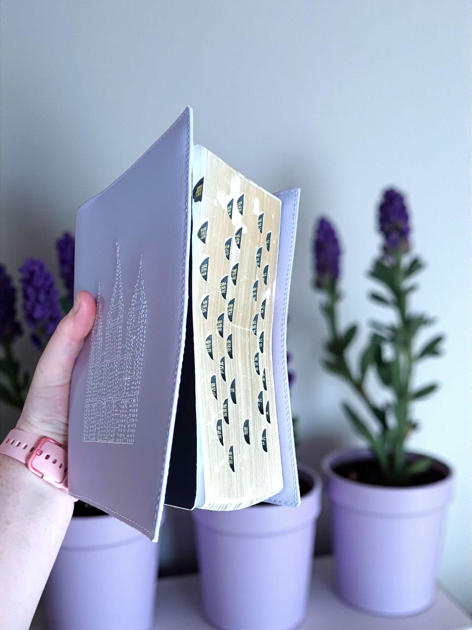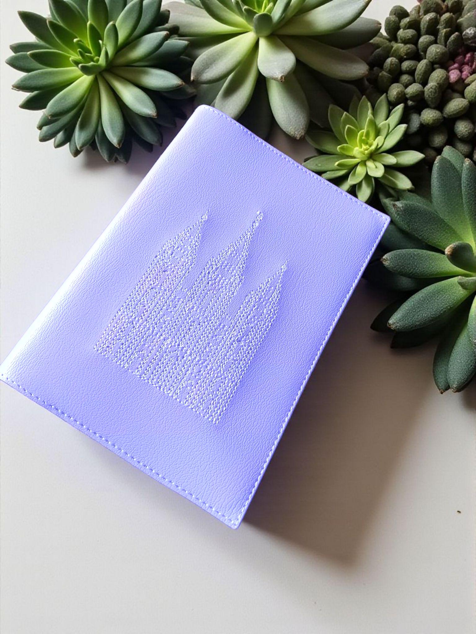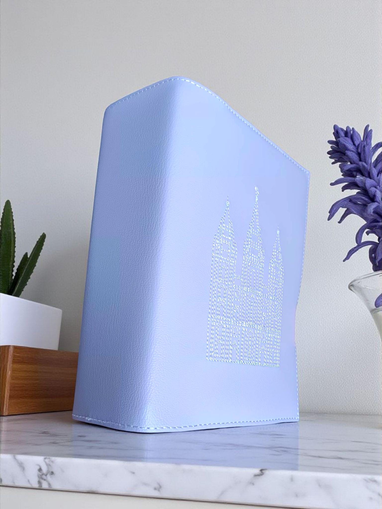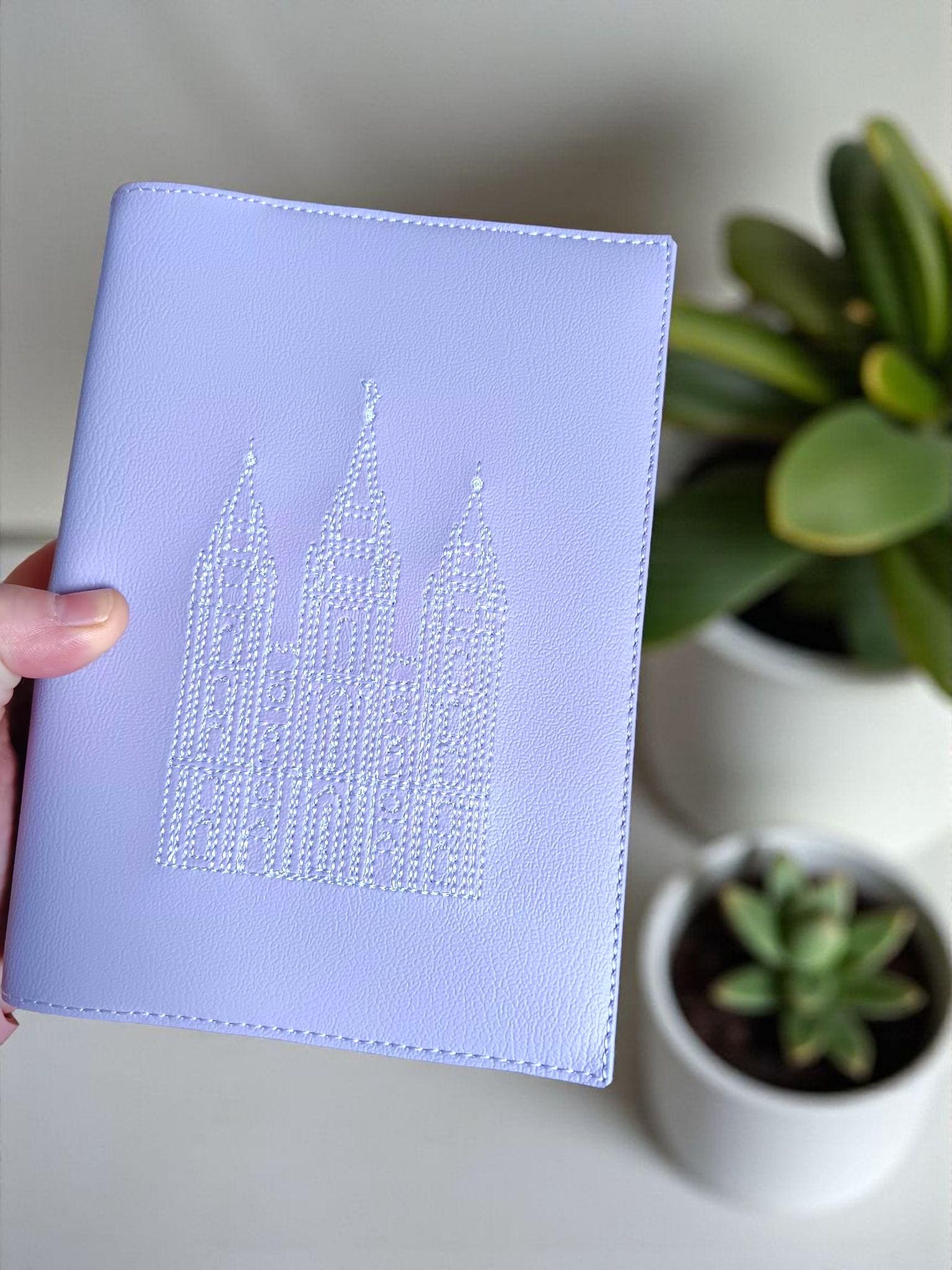 This pretty lavender scripture slipcover is sure to delight! It features a machine embroidered white Salt Lake Temple. The Temple is a reminder of the covenant path we enter at baptism and that families can together forever.