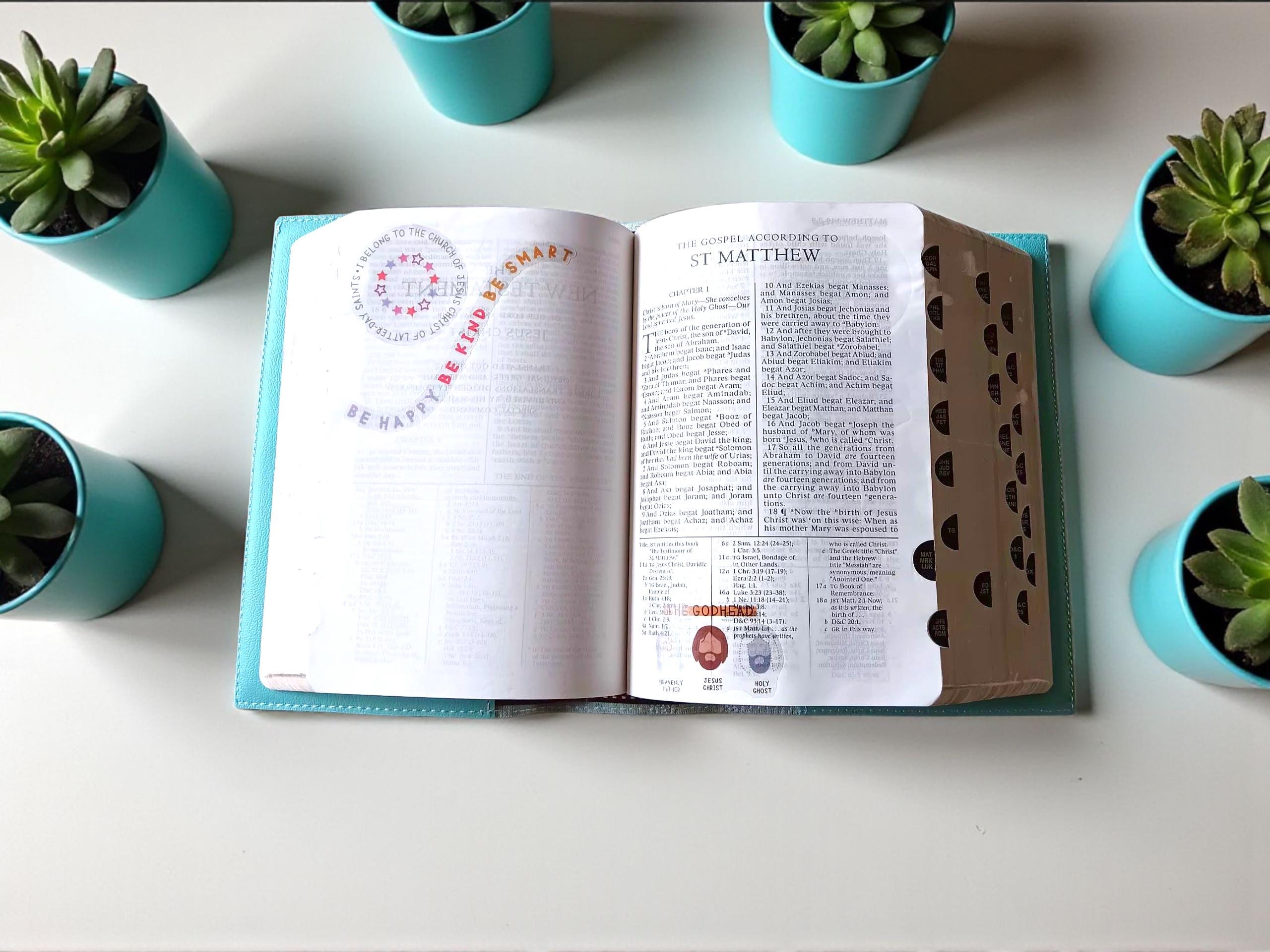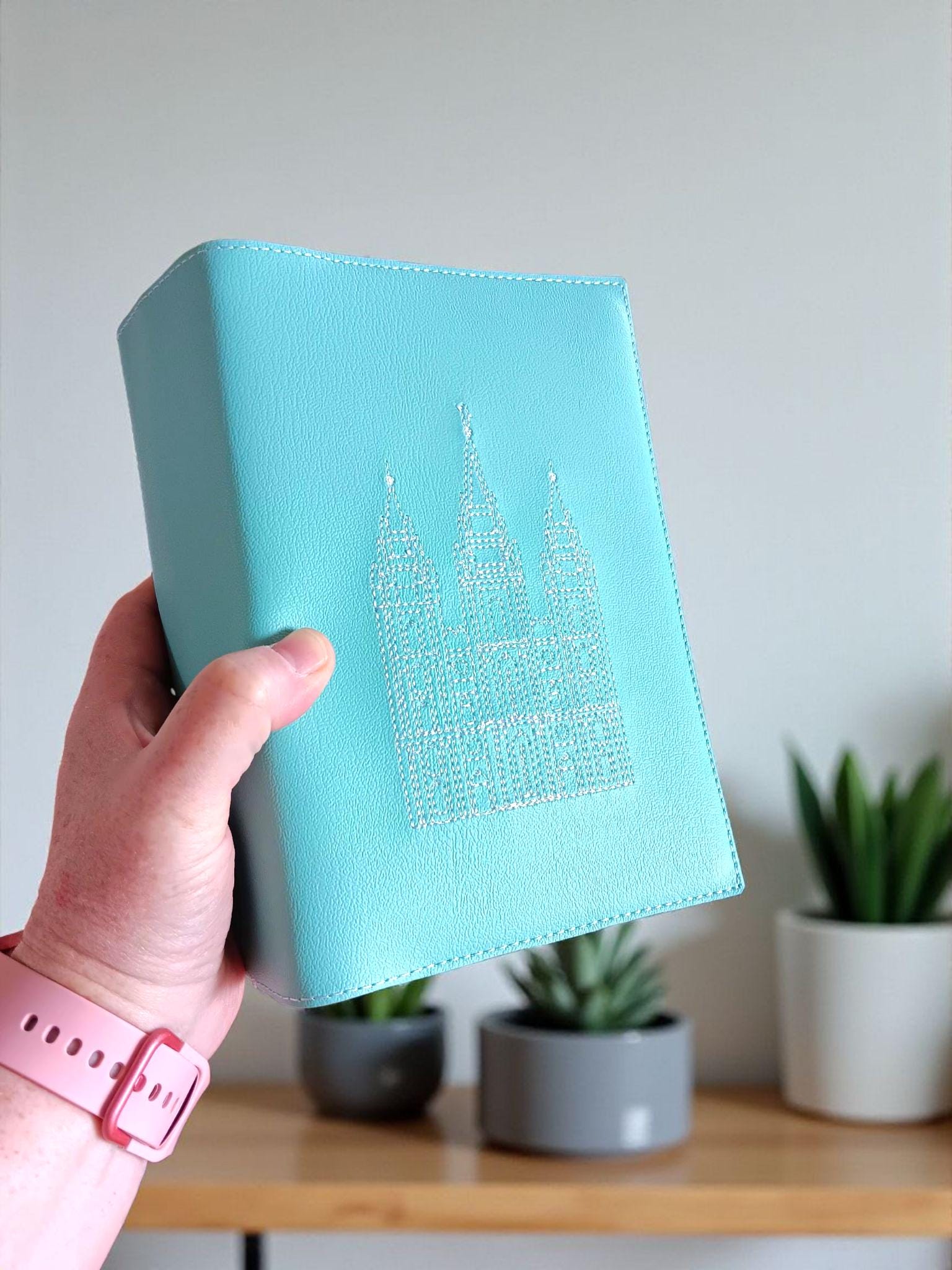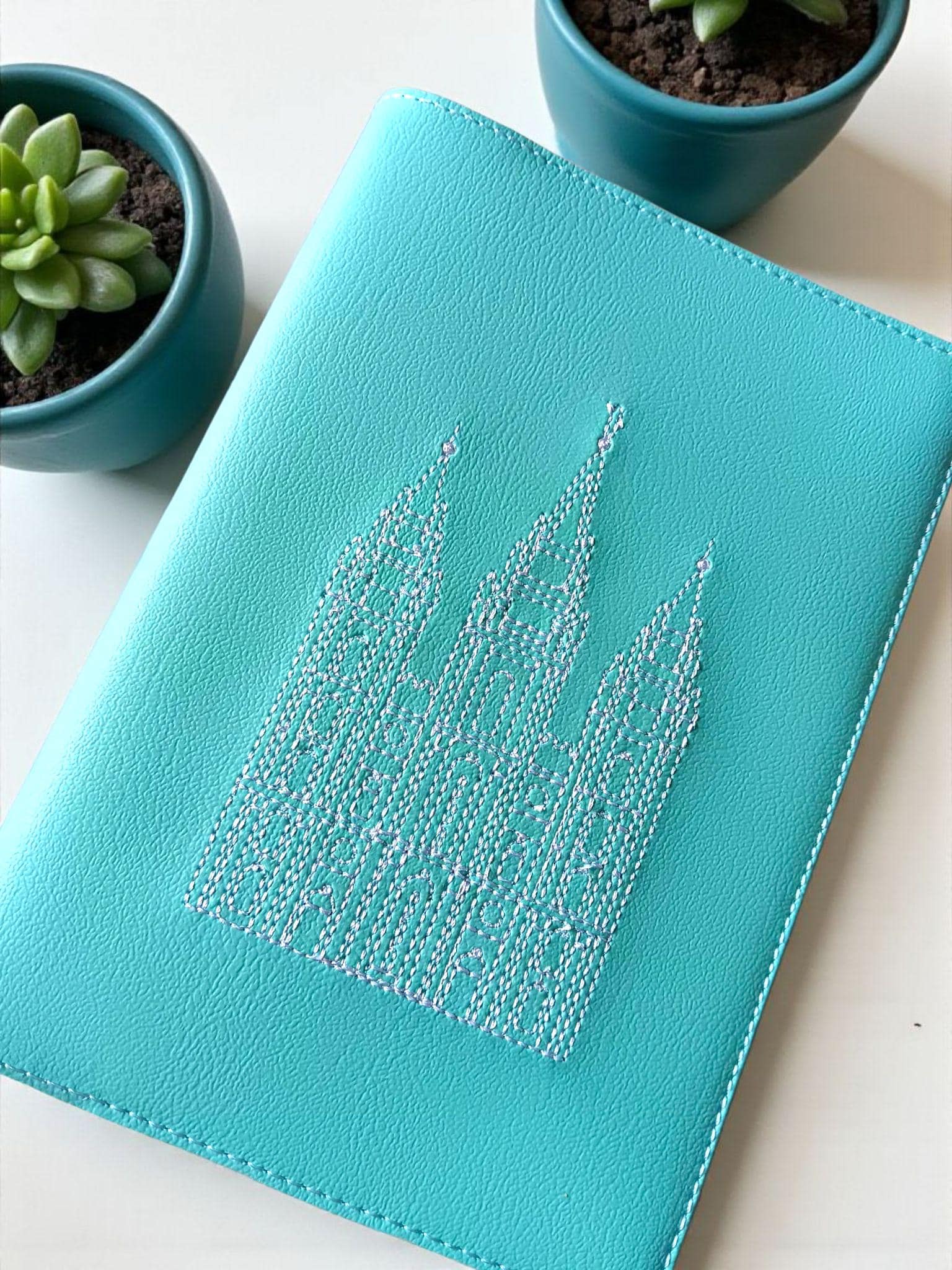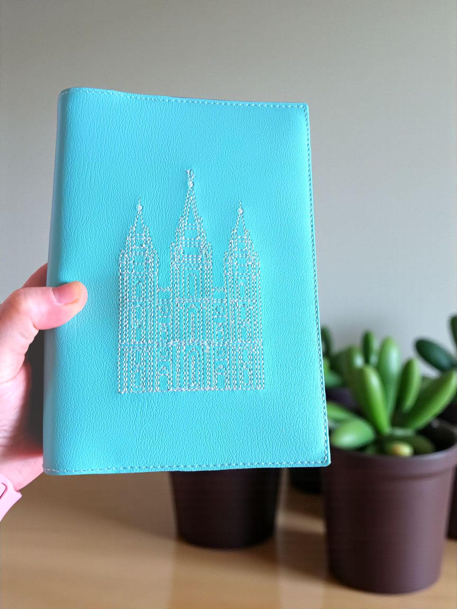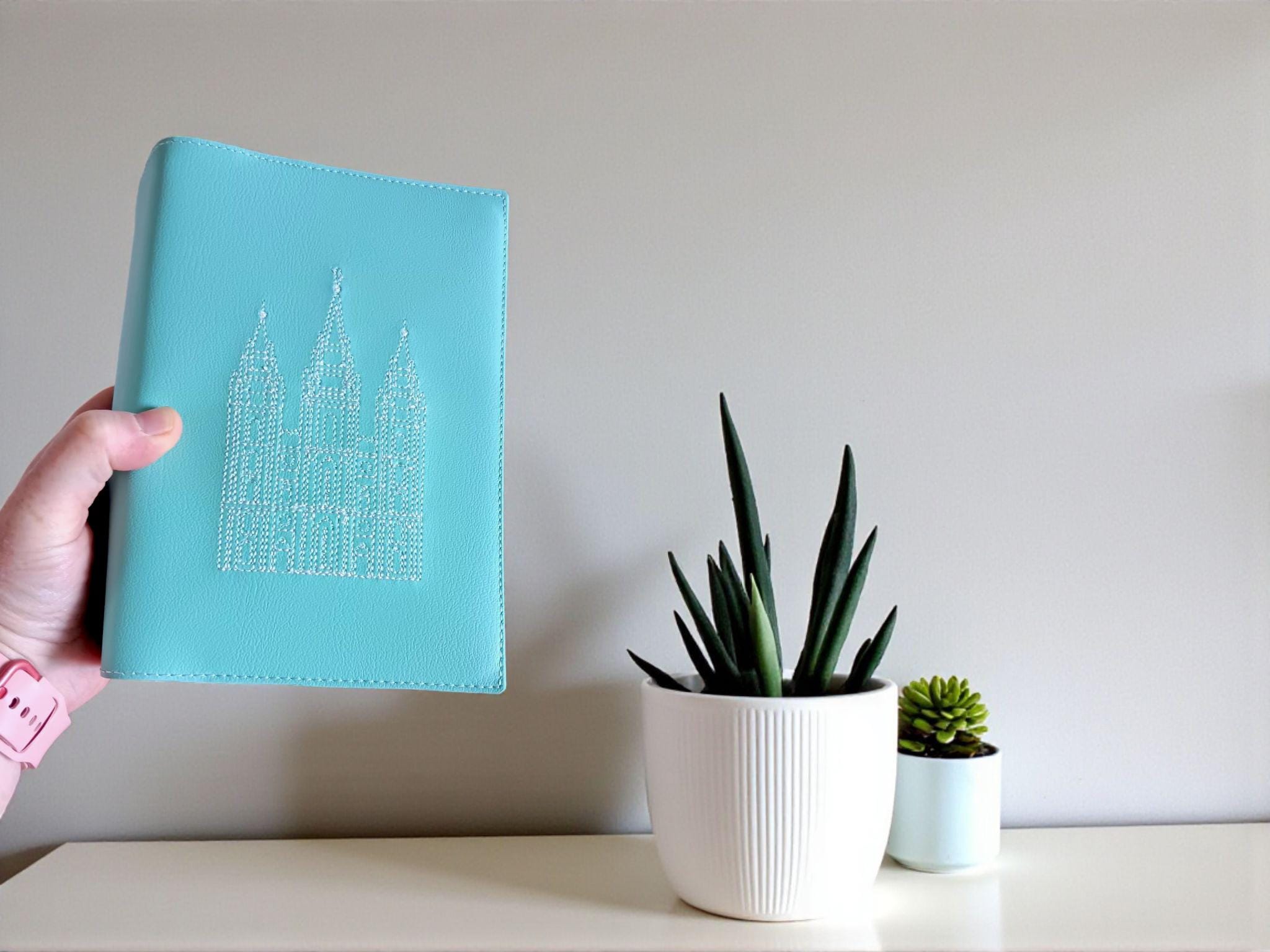 This pretty aqua scripture slipcover is sure to delight! It features a machine embroidered white Salt Lake Temple. The Temple is a reminder of the covenant path we enter at baptism and that families can together forever.